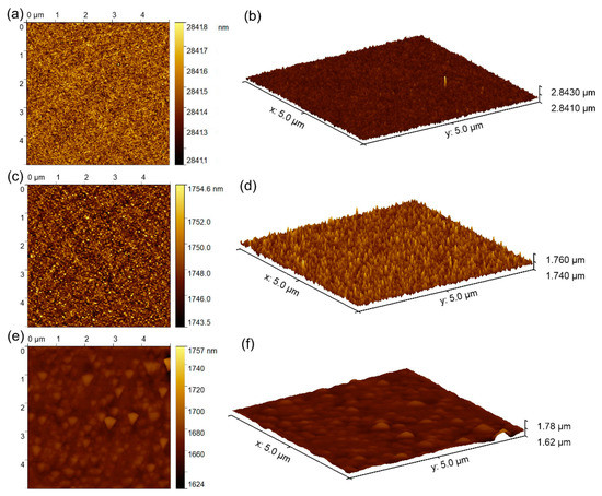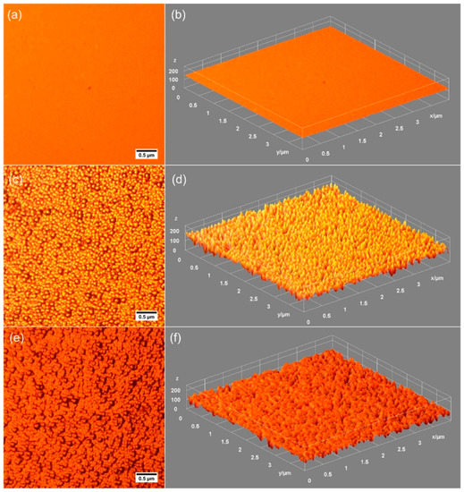 Additional information regarding the surface topography of the CS–HAp coatings obtained at various Ar gas working pressures (p = 2 × 10−3 mbar; p = 5 × 10−3 mbar; p = 1.2 × 10−2 mbar) was obtained by AFM investigation. Specific AFM topographies of the CS–HAp coatings are presented in Figure 8. Thus, for the CS–HAp coatings obtained at a p = 2 × 10−3 mbar, the AFM images show that they possess a smooth surface morphology (Figure 8a,b). A granular surface morphology was noticed in the case of the coatings deposited at higher Ar gas working pressures (p = 5 × 10−3 mbar and p = 1.2 × 10−2 mbar). An increase of granular structured could also be observed. On the other hand, the 3D representation of AFM topographies emphasizes similar modification, as previously noticed in the 2D representation.