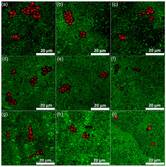 CLSM images of Candida albicans ATCC 10231 cell development on the surface of CS-HAp_1 (a–c), CS-HAp_2 (d–f), and CS-HAp_3 (g–i) after 24 h (a,d,g), 48 h (b,e,h), and 72 h (c,f,i) of incubation.