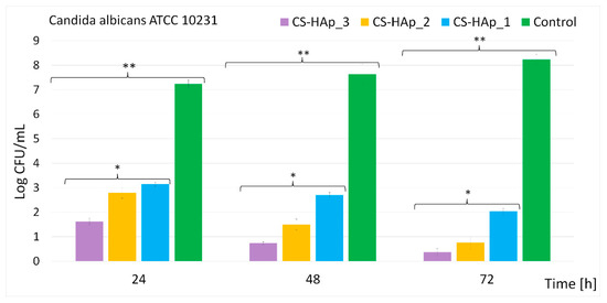 Antimicrobial activity of CS–HAp layers against Candida albicans ATCC 10231 at different time intervals. The results are presented as mean ± SD. Statistical analysis was performed by one-way ANOVA. The p-values indicated are the following: * p ≤ 0.003, ** p ≤ 0.0001.