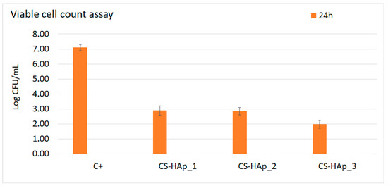In addition, a viable cell count (VCC) assay was performed to confirm the qualitative and quantitative investigations. The results of the VCC assay depicted in Figure 12 revealed a significant decrease in viable cells after 24 h of incubation with the CS–HAp composite layers. The number of VCCs was assessed only after 24 h of incubation, because after 48 and 72 h no viable cell counts could be recovered from the tested materials. Moreover, the VCC assay confirmed the results of the SEM and CLSM studies, and that emphasized that the layers did not allow C. albicans biofilm formation.
