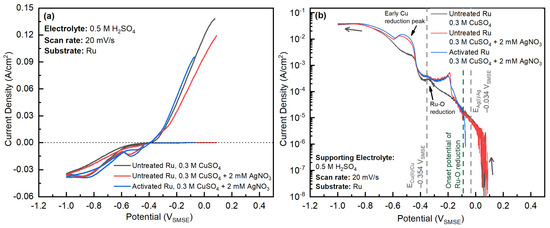 (a) Cyclic voltammograms from 0.3 M CuSO4 + 0.5 M H2SO4 with and without addition of 2 mM AgNO3 at activated or pristine Ru substrates [36]. Note that the Figure 1 (b) shows the current of the cathodic scans in log-scale.