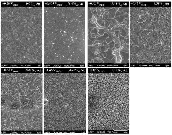 The SEM images of the deposits on Ru substrate are shown in Figure 2. A series of images starting at −0.38 VSMSE down to −0.85 VSMSE. At −0.38 VSMSE, the deposit is pure Ag, with a small grain size. At −0.405 VSMSE, the Ag content in the deposit is about 72%. Among these grains there are some elongated crystals. The deposits obtained at −0.42 to −0.65 VSMSE are Cu rich with at 90%–97% and large layered crystals are observed. In this potential regime, well-grown grains are seen. The grain morphology is faceted at small Cu depositions overpotentials, which is a characteristic of Cu electrodeposition [42,43,44]. Below the redox potential of the Ru surface oxide, the films are compact, with smaller grain sizes at higher deposition overpotentials. The deposit grown at −0.85 VSMSE shows a powdery morphology, seemingly evolving to a dendritic Ag-Cu film.