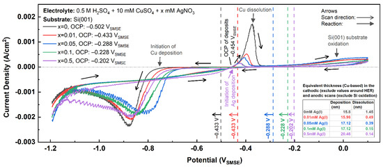 In the returning anodic scan of Cu-Ag bath at n-Si(001) substrate, the integral of the Cu dissolution peak is much less than the forward one (tabulated in the insert table of Figure 3). With a Cu-only deposition bath at n-Si(001), based on the CV profile, the anodic scan show only 8.2% deposited Cu (estimated by the thicknesses in Figure 3) is oxidized and dissolved. Adding Ag(I) into Cu deposition bath significantly weakens the Cu dissolution peak: with 0.5 mM Ag(I) in the 10 mM CuSO4 deposition bath, only 0.68% Cu is retrieved in the anodic scan of the CV test.