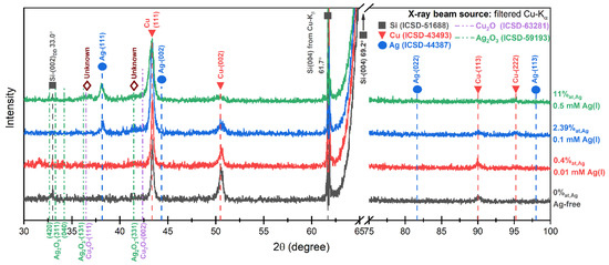 The XRD profiles were evaluated using the CrystalDiffract (v6.8.2) package of the CrystalMaker (v10.4.5) suite [37,38] with the Cu Kα set as the X-ray source, supported with the crystal structures of Cu (ICSD-43493), Ag (ICSD-44387), and Si (ICSD-51688) from the ICSD databases [39]. Due to an incomplete filtering of Cu Kβ during XRD measurement, the diffraction pattern of Si was also calculated with the wavelength of Cu Kβ (λ = 1.3922 Å) [40,41].