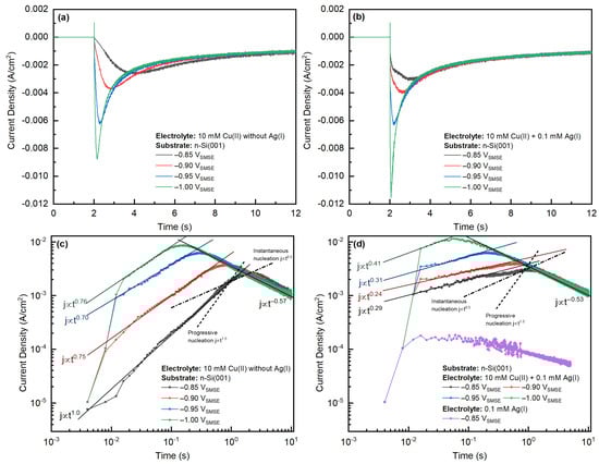 Potentiostatic transients and the fitting of transients from 10 mM CuSO4 + 0.5 M H2SO4 (a,c) without or (b,d) with the addition of 0.1 mM AgNO3 based on classical model [35]. The peak time is roughly 4s and the peak current is roughly −0.003 A/cm2.