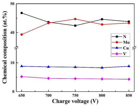 Chemical composition of Mo–Cu–V–N coatings as a function of charge voltage.
