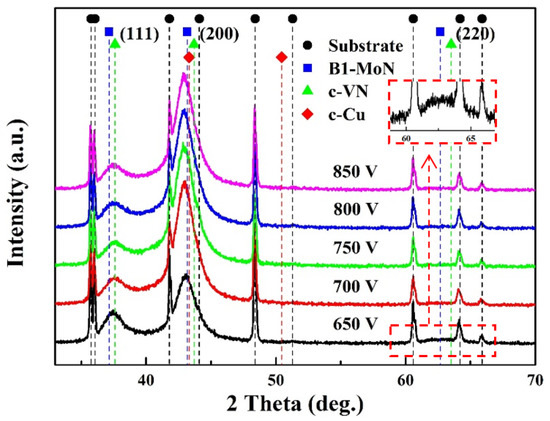 The XRD patterns of the coatings prepared at different charge voltages, as shown in Figure 4. At 650 V, three diffraction peaks at around 37.5°, 43.1° and 62.2° can be detected, corresponding to the (111), (200) and (220) planes with face-centered cubic structure, respectively. Based on Scherrer equation, the crystalline size of the coating calculated from (200) diffraction peak was ~5.3 nm. Because of the similar atomic radius of Mo (0.136 nm) and V (0.135 nm), a solid-solution phase of Mo–V–N could be achieved by addition of V into Mo-N lattice. When the V content was low, the V atoms in the Mo67V4N29 coating was nearly dissolved in the Mo-N phase [15]. When the V content was high, a single solid-solution phase of c-(V, Mo)N formed in the V0.57Mo0.43N0.95 coating [33]. In this study, the V content was low (4.3–5.2 at. %), a major phase of Mo–N would be formed in the Mo–Cu–V–N coatings, and the V atoms would be dissolved in the Mo-N phase. Even a high content of Cu (8.3–8.8 at. %) in the coatings, no diffraction peak of Cu phase could be detected in the XRD patterns, implying that Cu atoms existed as an amorphous phase. Similar phenomenon was observed in Mo–Cu–N coatings [12,34], the Cu atoms segregated as an amorphous phase at the grain boundary rather than in the crystalline lattices when the Cu content was below 11 at. %.