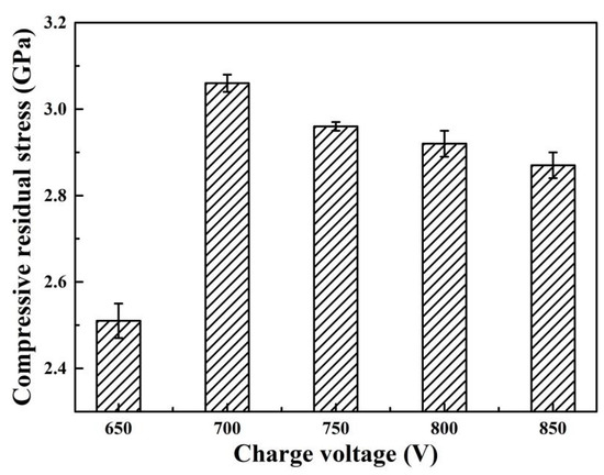 When the charge voltage increased above 700 V, the weak diffraction peak of (220) plane disappeared, and the (200) preferred orientation was further enhanced at higher charge voltages. By applying high charge voltages, the ion energy delivered to coating surface increased, contributing to an increase in adatom mobility. Thus, the adatom diffusion among grains occurred in the early and growth stage, the (200) plane with lowest surface energy would become the preferred orientation to minimize the overall energy [35]. When the charge voltage increased, the diffraction peaks shifted towards lower angles, indicating that an increase of lattice parameter. As shown in Table 2, the lattice parameters were calculated from the inter-planar spacing d200 of the preferred orientation peak. With increasing the charge voltage, the lattice parameter increased from 4.200 to 4.208 Å, which can be corresponded to the B1-MoN phase with lattice parameter ranged from 4.20 Å to 4.27 Å [12,36]. In general, the shift of diffraction peaks and the variation of lattice parameters can be caused by the high residual stress and/or interstitial solid solution in the coatings. As shown in Figure 5, all the coatings exhibited compressive residual stress due to atomic peening effect induced by ion bombardment during deposition [37]. As the charge voltage increased, the residual stress increased from 2.51 GPa at 650 V to 3.06 GPa at 700 V, and then slightly reduced to 2.87 GPa at 850 V. The initial increase in residual stress could be mainly caused by the enhanced ion bombardment at higher charge voltages [38].