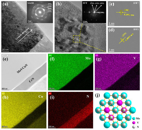 Cross-sectional TEM images of the Mo–Cu–V–N coating prepared at 750 V: (a) TEM image and corresponding SAED pattern, (b–d) HRTEM image with corresponding FFT/IFFT patterns, (e–i) HAADF image and STEM elements mappings, (j) schematic diagram of (111) plane of B1-MoVN crystal structure.
