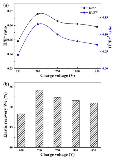 In general, the mechanical properties of hard coatings could be evaluated by the hardness (H), elastic modulus (E), H/E* ratio, H3/E*2 ratio, and elastic recovery We, etc. [40], among which the H/E* and H3/E*2 ratios can be used to predict the ability to resist elastic and plastic deformation, respectively. As shown in Figure 8a, the H/E* and H3/E*2 ratios presented a similar tendency with increasing charge voltage, both the H/E* and H3/E*2 ratios reached a maximum value of 0.068 and 0.13 at 700 V, respectively. It indicated that the best resistant against crack initiation and propagation was obtained for the coating deposited at 700 V. In addition, based on the above plastic deformation and elastic recovery curves during the loading–unloading process, the elastic recovery We can also be calculated by the ratio of recovered indentation depth to the maximum indentation depth. In Figure 8b, when charge voltage increased from 650 to 700 V, the elastic recovery We increased from 48% to 54%, and then slightly declined to 51% at 850 V.