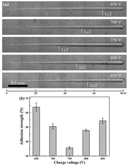 Scratch tracks (a) and adhesion strength (b) of the coatings at various charge voltages.