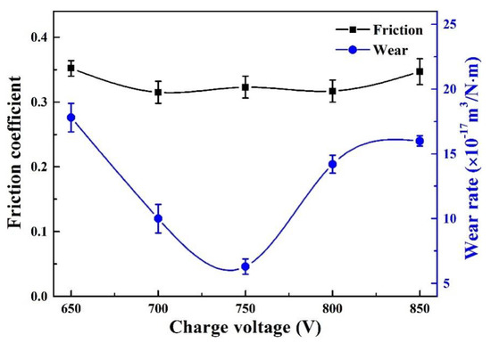 Figure 10 presents the friction coefficient and wear rate of the coatings at various charge voltages. A relatively low friction coefficient was achieved for the Mo–Cu–V–N coatings at room temperature, which varied from 0.32 to 0.35. As the charge voltage increased, the friction coefficient first slightly decreased and then rebounded at 850 V, and the wear rate exhibited a similar tendency. The wear rate decreased from 1.8 × 10−16 m3/N·m at 650 V to a minimum value of 6.3 × 10−17 m3/N·m at 750 V, and then slightly increased to 1.6 × 10−16 m3/N·m at 850 V. It indicated that the best tribological property was achieved at 750 V, which combined both excellent wear resistance and a low friction coefficient of 0.3. In generally, the variations of wear resistance and friction coefficient can be influenced by many factors, such as tribo-oxides formed on worn surfaces [14], the incorporation of soft metals (e.g., Ag, Cu, Ni) with low shear strength [43], and the mechanical strength of hard coatings (including the hardness and H/E* ratio) [44], etc. In this study, the best wear performance achieved at 750 V can be due to the combined effect of low friction coefficient caused by lubrication oxides and excellent wear resistance provided by enhanced mechanical strength. At 750 V, a relatively high Mo content in the coatings promoted the formation of larger fraction of MoO3 lubrication oxide on worn surface, resulting in a better wear performance [15]. Similar results were found in the Mo coatings [45], the excellent wear resistance was attributed to the high hardness and the formation of MoO3 lubrication oxide.