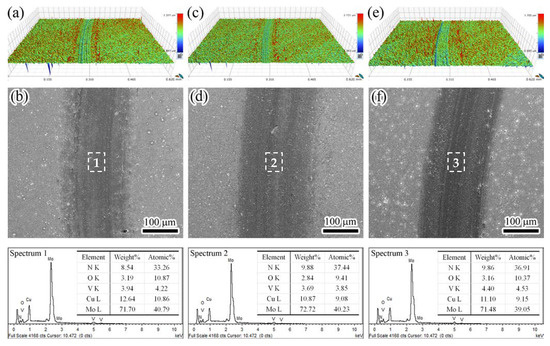Three-dimensional morphologies, surface micrographs, and EDS results of the selected wear tracks: (a,b) 650 V, (c,d) 750 V, and (e,f) 850 V.