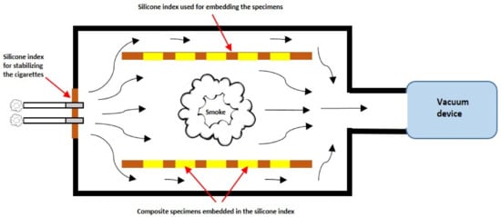 Custom made chamber device was made consisting of a vacuum system that directed the smoke to a custom-made plastic box (Figure 2 and Figure 3). The specimens were stabilized by polyvinyl siloxane putty index (manufacturer) which was placed inside the box at 8 cm distance from the smoke. The specimens were placed vertically on both sides of the customized chamber in order to mimic the intraoral scenario of restorations getting exposed to the smoking. Horizontal placement of the specimens was avoided intentionally to avoid unrealistic adherence of smoking dust to the specimens.