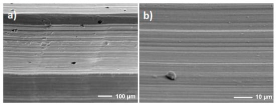 The microscopic investigation reference specimens after corrosion tests showed effects of pitting, some discontinuity of material, and a heterogeneous structure at the bottoms of the helix and at the tops (Figure 6). The microscopic investigation specimens oxidized in an electrochemical way and showed a network of cracks in the surface of the helix top and corrosion pitting in the bottom of the helix (Figure 7), it is probably related to the grater thickness of the obtained modification, which was confirmed by CT tests—Figure 4b.