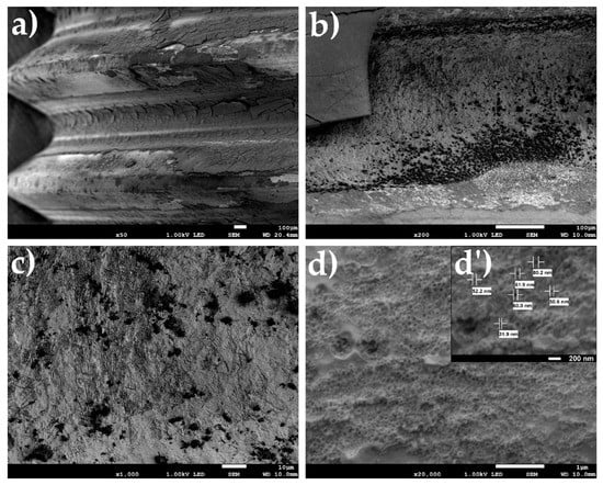 Surfaces of specimens oxidized in an electrochemical way: (a) view of specimen, (b) surface of helix top, (c) surface between top and bottom of the helix, (d) bottom of the helix (with different magnifications—d’, with the result of measuring the diameter of nanotubes).