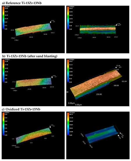 Results of topography tests are presented in Figure 3. The surface of the top oxide layer is rough and well developed. The roughness profile is 630 nm, the Sa average value is 1.39 ± 0.79 µm on the tip of the helix, and 5.69 ± 2.98 µm on the bottom of the helix (Table 3). Such values in the nanometric range are also useful. The differentiation of the area comprising small nanotubes and rough pores is important. Surface modification led to smoothing the tip of the helix as a result of dissolving roughness peaks. The influence of roughness on oseointegration has been proven. In the case of long-term implants, a positive osteoblast response is required. With increasing roughness, the possibility of osteoblasts settling increases [45]. High roughness also carries the risk of biofilm formation [46]. The topography results confirmed the obtaining of a surface with a high surface roughness value. The lowest values were obtained for the oxidized sample.