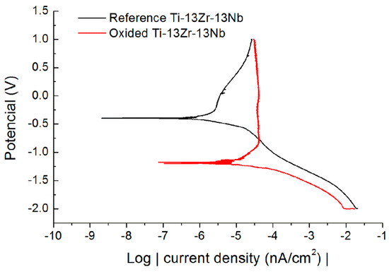 Potentiodynamic polarization curve of reference and oxidized Ti-13Zr-13Nb specimens.
