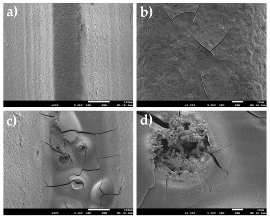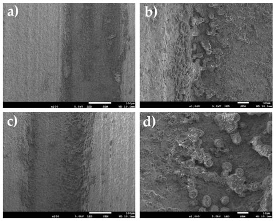 Surfaces of specimens oxidized in an electrochemical way after corrosion tests: (a) surface of helix top ×200, (b) surface of helix top ×1000, (c) bottom of the helix ×200, (d) bottom of the helix ×1000.
