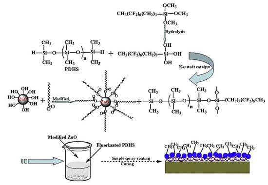 Schematic illustration of FPDHS/ZnO superhydrophobic coating. Reprinted with permission from [55]; Copyright 2014 Elsevier.