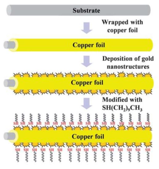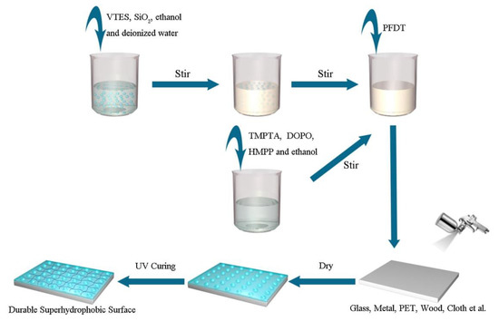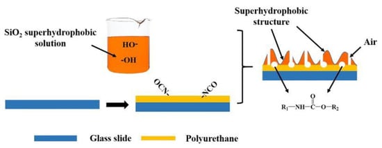 Illustration for the fabrication procedure of the superhydrophobic coating. Reprinted with permission from [65]; Copyright 2013 Royal Society of Chemistry.