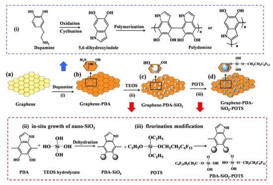 The schematic diagram of the synthesis of GP-SiO2-PFOTES particles. Reprinted with permission from [23]; Copyright 2019 Elsevier.