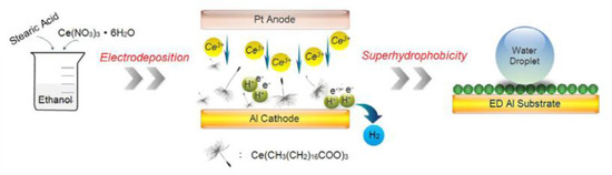 Schematic diagram of nonfluorinated one step fabrication of superhydrophobic coating on EP Al Surface. Reprinted with permission from [69]; Copyright 2018 Elsevier.