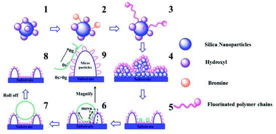 The superhydrophobic coatings fabricated by initiating polymerization from the surfaces of the silica nanoparticles can achieve good durability due to the formation of the covalent bond between the surface and the polymer. In the fabrication process, the fluorinated polymer chains were grafted onto nanoparticles. Atom transfer radical polymerization (ATRP) is attractive in the grafting-from approach because of its tolerance of impurities, mild polymerization conditions and compatibility with various monomers, whereas on the other hand, the requirement for the inert atmosphere of ATRP is challenging [99,100]. Therefore, ATRP using activators generated by electron transfer (AGET) was pursued [89,101]. Zhan et al. [89] proposed an anti-icing hybrid material with a high static WCA of 170.3° and a low CAH of less than 3° synthesized by grafting fluorinated polymer chains to silica nanoparticles via surface-initiated activators generated by electron transfer atom transfer radical polymerization (SI-AGET ATRP). The schematic illustration demonstrating this is shown in Figure 8. The coating exhibited anti-icing properties, which could not only promote the removal of droplets efficiently but also lower the crystallization point and delay the freezing time.