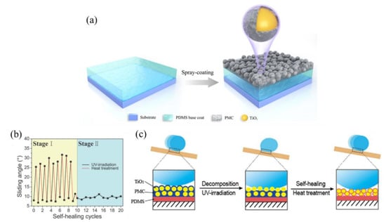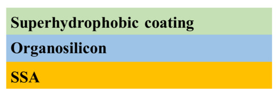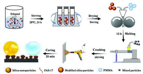 Nanoparticles, such as nano-silica (SiO2), nano-titanium dioxide (TiO2) and nano-calcium carbonate (CaCO3) are widely used as surface roughening materials, and alkyl or fluorinated organic silanes, polydimethylsiloxane (PDMS)-based polymers and their combinations act as the main reactive molecules used for low surface energy modification [44,45].