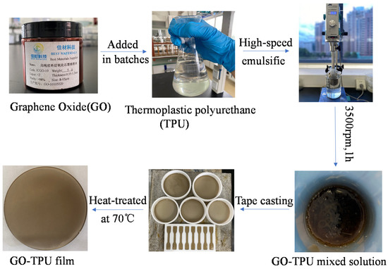 Schematic diagram of the fabrication process of graphene oxide-thermoplastic polyurethane (GO-TPU) composite film.