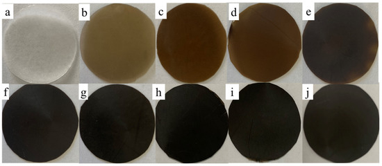 The base and edges of GO have a large number of oxygen-containing functional groups, such as epoxy groups, hydroxyl groups, carboxyl groups, and carbonyl groups, so that GO can have good compatibility with polymer substrates. Figure 2 shows photographs of the pure TPU film (a) and GO-TPU films prepared with the initial concentration of 20 wt % TPU and the loadings of GO of 0.1 wt % (b), 0.3 wt % (c), 0.6 wt % (d), 1 wt % (e), 2 wt % (f), 3 wt % (g), 4 wt % (h), 5 wt % (i), and 7 wt % (j), respectively. It can be seen from the photographs that the pure TPU film has good transparency, and the GO-TPU composite films with a small amount of GO are brown and opaque (Figure 2b–d). As the loading of GO increases, the GO-TPU composite film appears black, indicating that GO sheets are stacked and the graphitization occurs in the TPU.