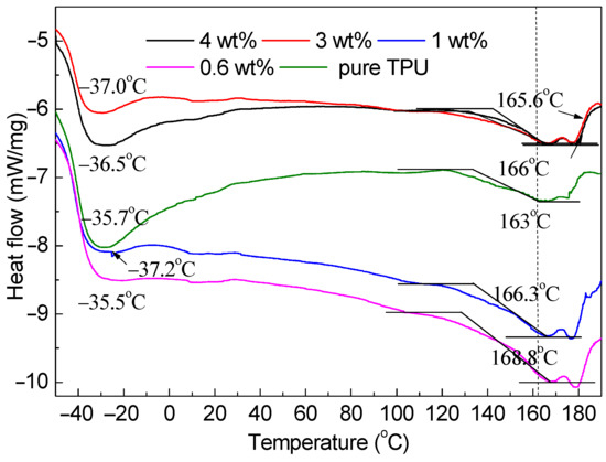 DSC measurements of pure TPU and GO-TPU films prepared with the loading of GO of 0.6 wt %, 1 wt %, 3 wt %, 4 wt %, respectively. Numbers in plot stand for the glass transition temperature and melting point.