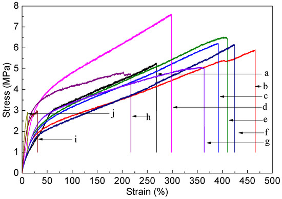 Stress–strain curves of pure TPU film (a) and GO-TPU films prepared with loadings of GO of 0.1 wt % (b), 0.3 wt % (c), 0.6 wt % (d), 1 wt % (e), 2 wt % (f), 3 wt % (g), 4 wt % (h), 5 wt % (i), and 7 wt % (j), respectively.