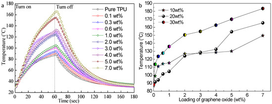 In recent years, graphene oxide sheets as the functional fillers for polymer have aroused the interest of researchers [6,24,28,36,42,43]. However, most of them only paid attention to the improvement of the mechanical and thermal properties of composite materials. However, same as graphene, GO also has excellent photothermal conversion capabilities. In here, we investigated the near-infrared photothermal response performance of GO-TPU film under the irradiation of infrared lamp with an infrared light intensity of 3450 lux (the distance between the infrared lamp and the sample is 10 cm) for 60 s and then turn off the infrared lamp. Figure 10 shows the time-dependent temperature of GO-TPU film with an initial concentration of TPU of 20 wt % under near-infrared light with different loadings of GO (Figure 10a) and the maximum conversion temperature with initial concentrations of TPU of 10 wt %, 20 wt %, and 30 wt %, respectively, and different loadings of GO after 60 s of infrared light irradiation (Figure 10b). Seen from Figure 10a, the temperature of the GO-TPU film rises sharply within 30 s after infrared irradiation, and then the rise rate gradually slows down in the subsequent 30 s. Figure 10b shows that the maximum conversion temperature of the GO-TPU film increases with the increase of the loading of GO under infrared light irradiation 60 s. When the loading of GO is 7 wt %, the maximum conversion temperatures of GO-TPU film with the TPU initial concentration of 10 wt %, 20 wt %, and 30 wt % reach a maximum of 149.6 °C, 165.6 °C, and 183.6 °C, which is an increase of 30.8%, 63%, and 43.8%, respectively, compared to pure TPU. On the one hand, GO has excellent infrared light-to-heat conversion ability, which can convert infrared light into heat and transfer it to the substrate; the photothermal conversion efficiency is related to the distribution of GO. The GO sheets stack and agglomerate in case of the low initial concentration of TPU because of the internal stress between the GO sheets; while the GO sheets are difficult to disperse in case of the high initial concentration of TPU.