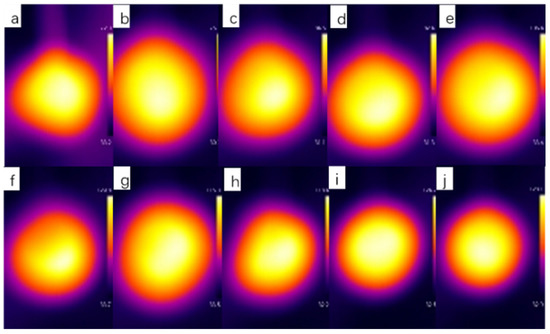 Infrared images of the GO-TPU films with loadings of GO via IR light pure TPU (a), 0.1 wt % (b), 0.3 wt % (c), 0.6 wt % (d), 1 wt % (e), 2 wt % (f), 3 wt % (g), 4 wt % (h), 5 wt % (i), and 7 wt % (j), respectively.