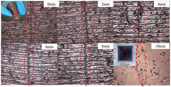 We further studied the self-healing performance of GO-TPU films with different loadings of GO by infrared light. Figure 12 shows the optical microscope photographs of self-healing of GO-TPU with an initial concentration of TPU of 20 wt % and GO of 2 wt % under infrared light with an infrared light intensity of 3450 lux (the distance between the infrared lamp and the sample is 10 cm). It can be seen from Figure 12 that there is an obvious scratch on the surface of the GO-TPU film before the infrared light is turned on. After the infrared lamp is turned on, as the irradiation time increases, the scratch is gradually repaired. The scratch completely disappeared after the infrared lamp irradiated for 10 min. In addition, with the increase of the infrared lamp irradiation time, the sample surface gradually brightened. This may be due to the thermal melting and solidification of the GO-TPU film [16,42,43,44,45].