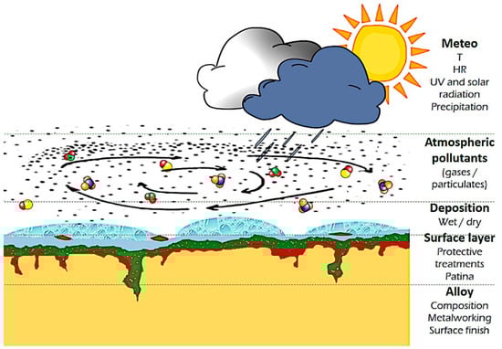 The present understanding of copper and copper alloys atmospheric corrosion ([], chapters 8, 13, 14; appendix E, K), can be roughly described as the formation of a passivating cuprite layer in clean humid air which evolves into a more complex surface layer (patina) according to the main pollutants present in the surrounding atmosphere [,,]. Green basic copper hydroxysulfates (mainly brochantite) form in SO2 rich atmosphere, while basic hydroxychlorides (atacamite, clinoatacamite) dominate marine environments []. Alloying elements play a key role in the corrosion mechanism, which differs from pure copper [,,,]. A decuprification process was identified [,,], along with cyclic corrosion similar to the “bronze disease” traditionally associated with archaeological copper alloys [,,,]. The growth of this surface layer on outdoor bronze sculptures and architectonic elements exposed to different weather and pollution conditions is the result of a specific timeline. Several factors determine its local composition and texture, such as the solubility of corrosion products, sheltered and unsheltered exposure, the changing weather (relative humidity, temperature, light and Ultra Violet (UV) radiation, time of wetness), the composition and concentration of air pollutants (Figure 1).