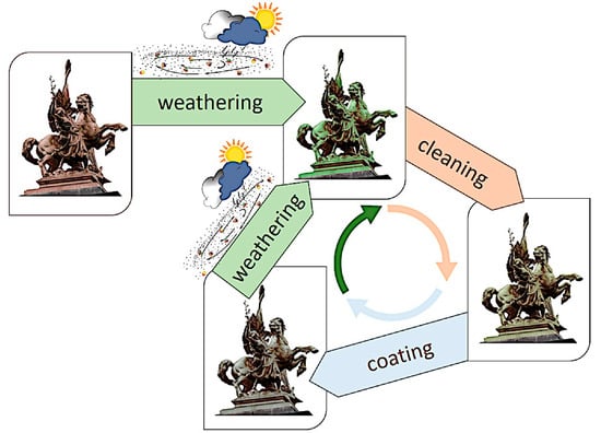 On a single monument, different conditions are often present, and the evolution of the overall result can be detrimental for aesthetic reasons if not for the material loss [,]. This leads to the necessity of restoration. The first step consists of cleaning [,,]. The cleaning methodologies adopted should selectively remove only water-soluble compounds [], atmospheric particulate deposits, hydrocarbon compounds coming from environmental pollution and other organic compounds from past treatments [] or failed coatings []. At the same time, it should preserve the part of the patina valuable for aesthetic, historical and conservation reasons [,]. Afterward, the common practice consists in the use of treatments to prevent or reduce detrimental corrosion, which for outdoor bronze consist in the application of coatings that avoid the contact of the metal/patina layer with the actively corroding agents in the atmosphere (water, corroding ions) and/or other treatments (inhibitors) to reduce the electrochemical reaction rates [,]. Sooner or later, cleaning and application of a protective treatment should be repeated, according to environmental conditions, maintenance programs, etc. (Figure 2).