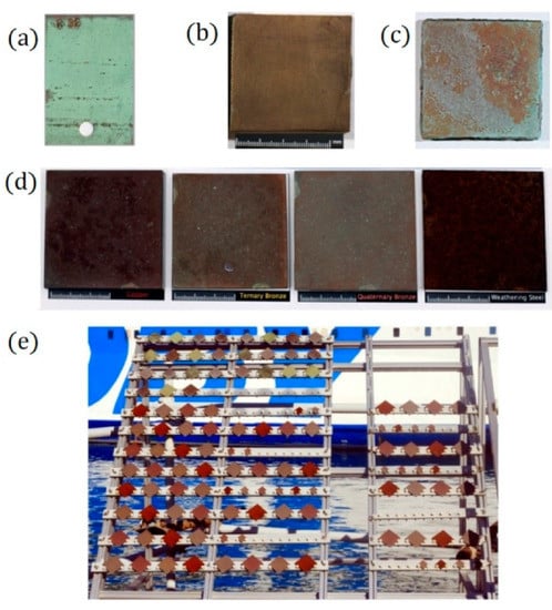 Some of the patinated coupon used for treatment testing: (a) old copper roof []; (b) K2S foundry patina on sand blasted bronze []; (c) Quaternary Bronze naturally weathered 18 months (initially sprayed; see text) [] at Genoa Experimental Marine Station (GEMS); (d) Copper, Ternary Bronze, Quaternary Bronze and Weathering Steel coupon after 18 m natural weathering [] at GEMS; (e) Exposure rack with copper alloys coupons weathering at GEMS.