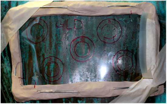 Getting data on the specific corrosion of heritage metals is a great challenge []. This is especially true for outdoor bronze monuments, which have large and uneven surfaces. The availability of portable, in situ Non-destructive Techniques greatly help a wider characterisation of artworks and allow a straightforward comparison of results on coupons and on heritage metals [,]. As corroded bronze surfaces may have quite an uneven appearance, the use of frames (Figure 4) to re-position the measurement area of the instruments in a precise manner is strongly advised for monitoring purposes.