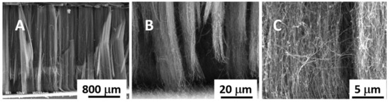 Cross-sectional view of SEM images of one-dimensional carbon nanotubes (CNTs) grown on a silicon wafer under CVD conditions for the nanocarbon coating on silicon flakes at 850 °C. (A) Top-to-bottom cross-sectional view of the CNT forest; (B) CNT bundles near the substrate after having been wiped off by a razor blade; (C) Magnified view of (B).