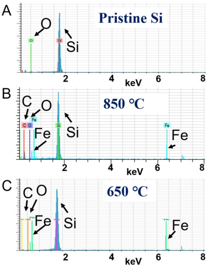 EDAX spectra of (A) as-received silicon flakes and those coated by CNTs and nanocarbons, using ferrocene and camphor in water vapor at (B) 850 °C and (C) 650 °C.