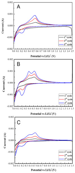 Figure 9 shows cyclic voltammetry analysis of the first three cycles of lithiation and delithiation processes for as-received silicon flakes and silicon flakes having been coated with nanocarbons. The cyclic voltammetry equipment and methods of measurement and analysis are reported in detail in [20]. Figure 9A shows the CV curves for the first three cycles of the anode made of as-received silicon flakes without nanocarbon coatings. The lithiation of crystalline silicon occurs at 0.0 V and converts crystalline silicon into amorphous lithium–silicon alloys. The subsequent delithiation of lithium–silicon alloys does not cause silicon to re-crystallize, but, instead, silicon remains amorphous. The subsequent lithiation of amorphous silicon beginning from the second cycle occurs near 0.2 V. The peak near 0.6 V shows the delithiation of the anode made of as-received silicon flakes without nanocarbon coatings. The lithium–silicon alloys dissociate to release lithium ions into the electrolyte [48,49]. The delithiation of lithium–silicon alloys results in amorphous silicon. Due to poor conductivity of as-received silicon flakes, the peak currents shown in Figure 9A are low.