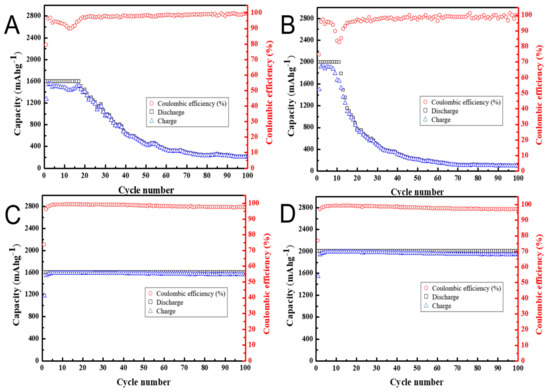 Cycling performance at the maximum lithiation (discharge) capacity of (A,C) 1600 mAh/g and (B,D) 2000 mAh/g for anodes made of (A,B) as-received silicon flakes and (C,D) nanocarbon-coated silicon flakes at 650 °C. The discharging/charging rate is 0.01 C for the first three cycles and 0.1 C for remaining cycles. Only the weight of silicon is included in the calculation of the specific capacity.