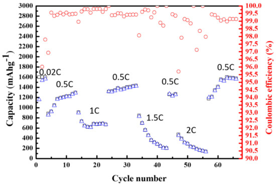 Figure 12 shows the cycling performance of anode based on silicon flakes with nanocarbon coatings at 650 °C. The maximum capacity is set at 1600 mAh/g. When the discharging–charging rate increases from 0.02 to 2 C, the capacity decreases some. When the discharging–charging rate decreases from 2 C, the capacity increases to about the previous level at the same rate. The Coulombic efficiency varies mostly between 99% and nearly 100%. This shows the excellent durability and Coulombic coefficient of the nanocarbon coated silicon-flake-based anode under the cycling conditions.