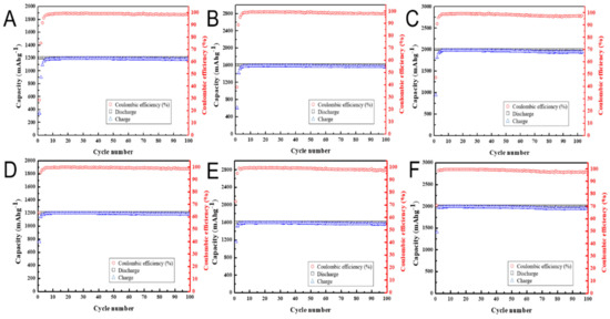 Figure 14 shows cycling performance of nanocarbon coated silicon-based anode coated with nanocarbons at 650 °C and (A–C) without and (D–F) with Super-P conductivity enhancing agent. The cycling performance is compared at fixed discharging and charging levels of (A,D) 1200 mAh/g, (B,E) 1600 mAh/g, and (C,F) 2000 mAh/g. The lithiation is carried out until a preset capacity is reached. The delithiation process then follows. Three capacity levels, i.e., 1200, 1600, and 2000 mAh/g, are compared. Figure 14 shows that the addition of up to 20% by weight of Super-P makes no difference in the cycling performance in comparison with the anode made of nanocarbon coated silicon flakes without Super-P carbon black additive. The discharging/charging rate is 0.01 C for the first three cycles and 0.1 C for remaining cycles.