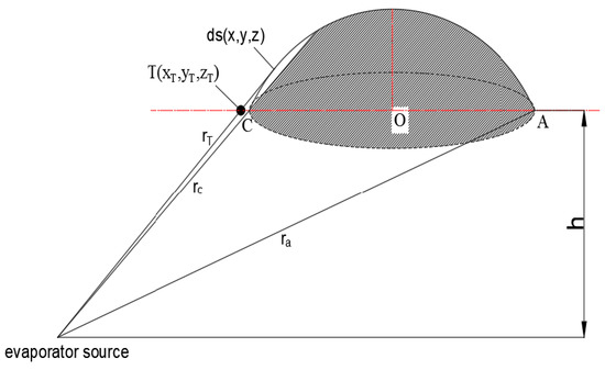According to the geometric relationship, the molecules can arrive at the surface when point T falls within the CA. Otherwise, no molecules which are evaporated from the evaporator source accumulate at the surface. Therefore, the shading function can be defined as [