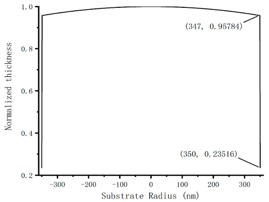 Figure 3. However, irrespective of adjustments to the geometric configuration parameters, the non-uniform region covers only 3–5 mm according to the simulation results. Although it is clear that the obscuring of the outer contour has a great impact on the film thickness at the edge of the surface, the non-uniform area is nearly negligible because the edge area usually does not require coating for large-aperture reflective mirrors. Consequently, in the following analysis and discussion, the non-uniform region is not afforded further consideration.