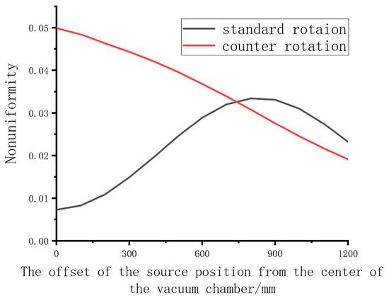 Moreover, there is a difference in the uniformity of the two paths when the evaporation source is at the same location. Therefore, the influence of the evaporation source on the film uniformity should be considered for the standard and counter PRSs. For the 0–350 mm range, the relationship between the film nonuniformity and the offset of the source position from the center of the vacuum chamber is shown in