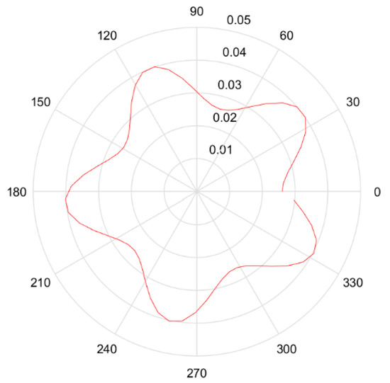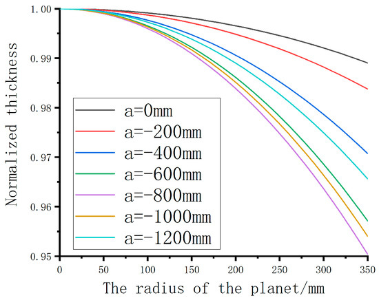 Figure 9 shows the sum of the film thickness at the point 350 mm along the radius of the planet after 37 revolutions, for which the evaporation source is in different positions. It is apparent that the film thickness is much greater at the coordinate (0, 0, 0) of the source position than that at the coordinate (−900, 0, 0) for angular positions ranging from (−2π/3) to (2π/3).